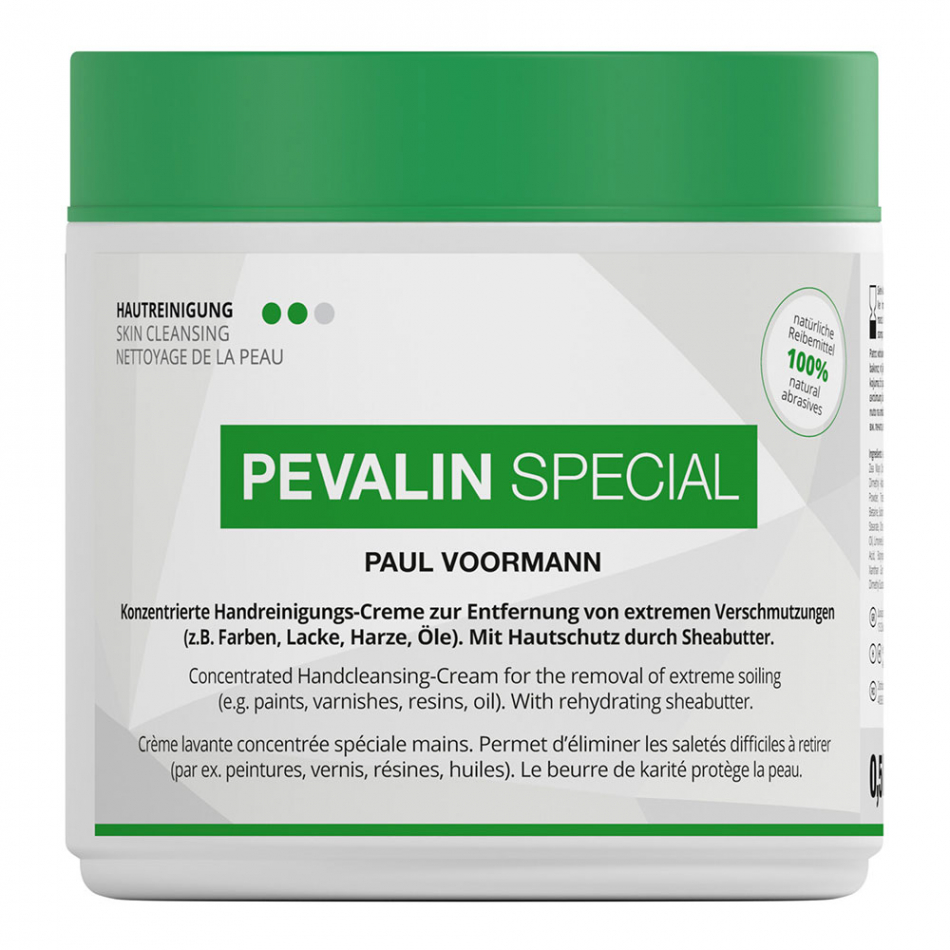 Pevalin limpia manos proporciona una hidratación efectiva. el producto contiene un aceite de éster que disuelve la suciedad y no daña la piel y pequeñas esferas de abrasivos naturales hechas a partir de cáscaras de nuez y mazorcas de maíz, que contribuyen al excelente efecto de limpieza. la manteca de karité natural y los extractos del aceite de coco ofrecen una gran hidratación para la piel. aplíquese pevalin special en las manos secas sin agua hasta que toda la suciedad se haya disuelto. luego, agregue un poco de agua, siga lavándose las manos y enjuágueselas bien con agua. tesa