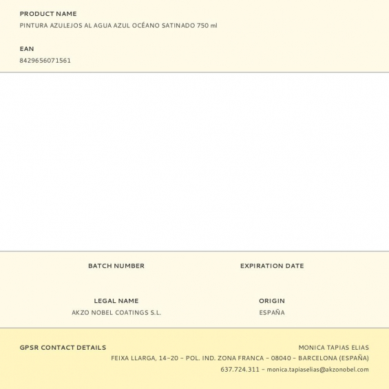 Pintura azulejos (pared) al agua satinado azul océano 750 ml fácil aplicación. acabado de gran dureza, resistente a las condiciones especiales propias de cocinas y baños. resistente a productos de limpieza, sin olor, no amarillea, 2 en 1 imprimación y acabado, secado rápido. para interior. no apto para inmersión, ni zonas con condensación constante. no utilizar para baldosas de suelo ni encimeras, rendimiento aproximado 7,5 m², secado en 1-1,5 h