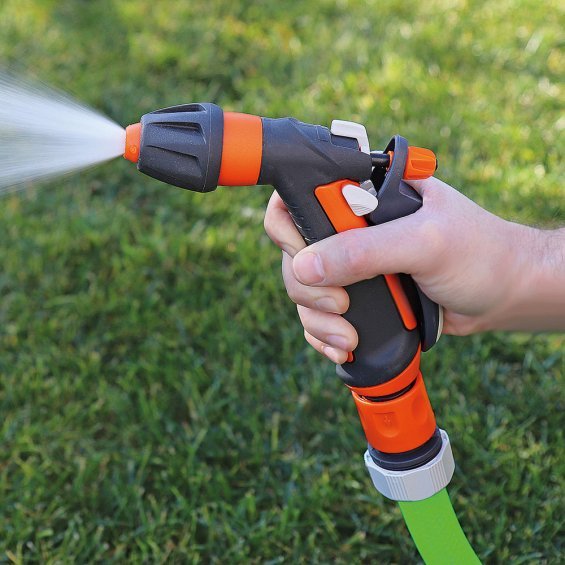 Pistola pulverizadora de riego regulable. con enchufe rapido. 14x20cm. color: gris/naranja. material polipropileno.