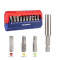 Juego de 13 puntas de destornillador (métrico). 12 puntas cromo vanadio de 25 mm: sl4 mm, 5 mm, 6 mm, ph1, ph2, ph3, t10, t15, t20, t25, t30. 1 soporte magnético para puntas de 60 mm, empuje lateralmente para abrir y coger las puntas. workpro