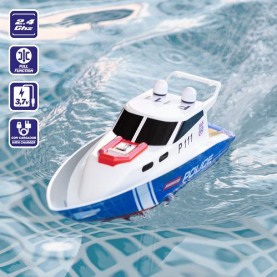 ¡Diviértete pilotando esta auténtica lancha radiocontrol de policía Racing Boat en la bañera o en la piscina! Gracias a sus dos hélices incorporadas es capaz de moverse a 6-8 km/h y alcanzar una distancia de 35 a 40 metros. Incluye mando radiocontrol con frecuencia 2.4 GH.z para moverla en 6 direcciones cuando esté en contacto con el agua. Un juguete ideal, con el que podrás jugar hasta 18 minutos seguidos, que potencia la habilidad manual, favorece la orientación espacial y desarrolla la imaginación de los más pequeños. ¡Demuestra tus habilidades manejando esta lancha rápida e imagina que eres un piloto de carreras profesional! -Edad y valores: juguete recomendado a partir de 4 años, que favorece la orientación espacial, desarrolla la imaginación y potencia la habilidad manual -¡Vive emocionantes persecuciones a una velocidad de 6-8 km/h con la lancha radiocontrol Racing Boat! ¡Es capaz de alcanzar una distancia de 35 a 40 metros! -Diseño: lancha rápida de policía con medidas 36x10x10 cm, equipada con dos hélices para una navegación ágil y dinámica -Funciones: incluye mando remoto con frecuencia 2.4 GHz que permite ir hacia adelante/atrás y avanzar/retroceder girando a izquierda o derecha. Tiene una duración de juego de 18 minutos. Para mayor seguridad, la lancha solo funcionará cuando esté en contacto con el agua -Pilas y batería: la lancha funciona con una batería recargable (incluye cargador) y el mando con 2 pilas AA (incluidas)