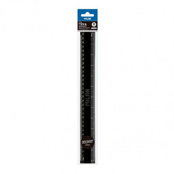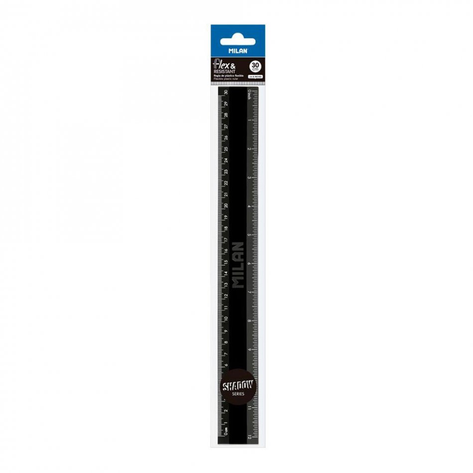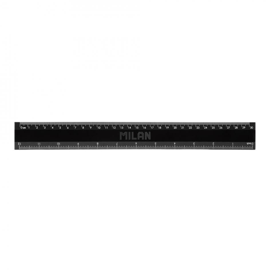Regla de 30cm. color negro opaco, serie especial shadow. plástico rígido y resistente. centímetros y pulgadas.