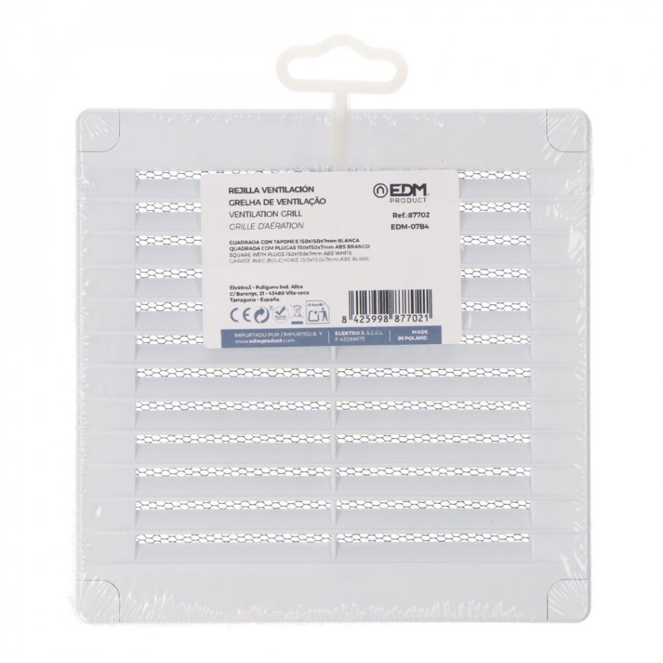 Rejilla ventilación cuadrada con tapones y mosquitera 150x150x7mm abs blanca