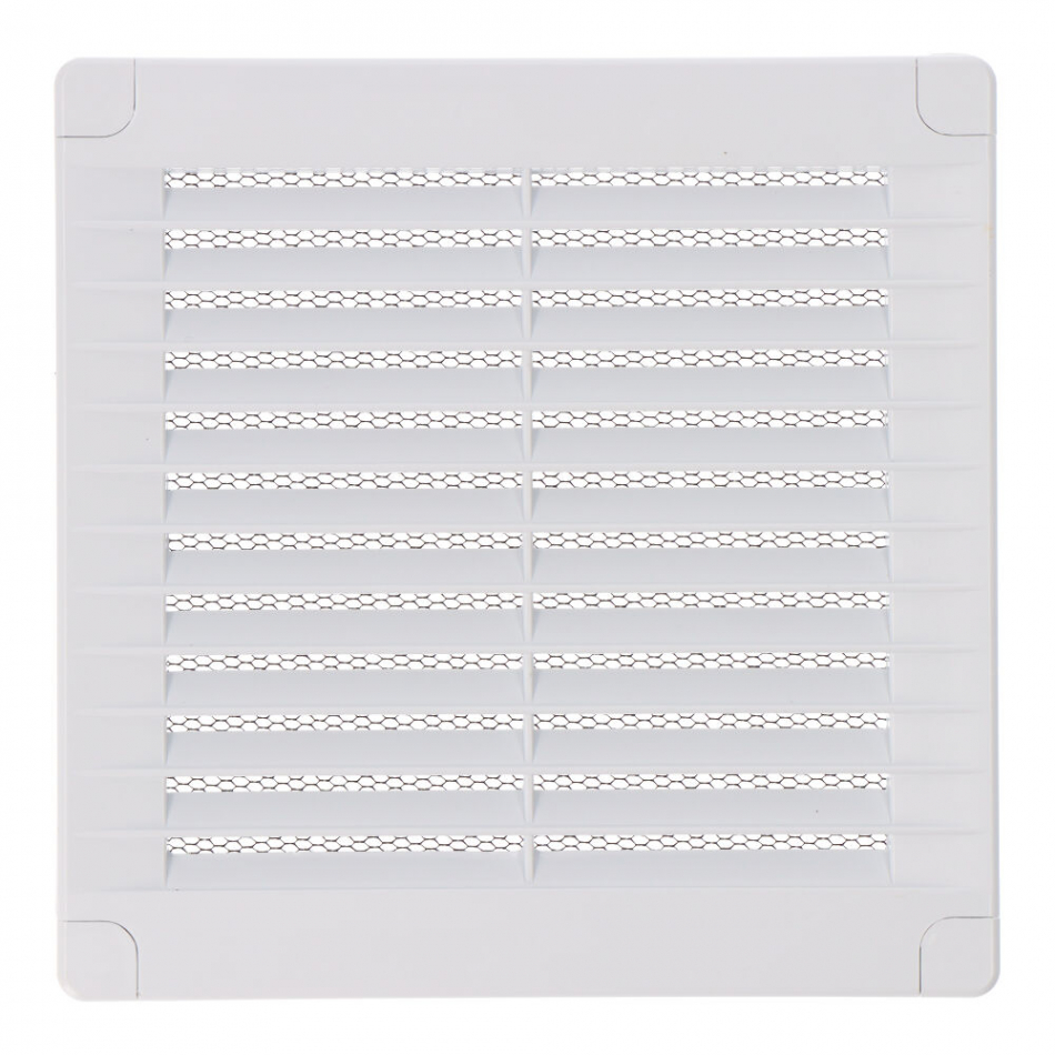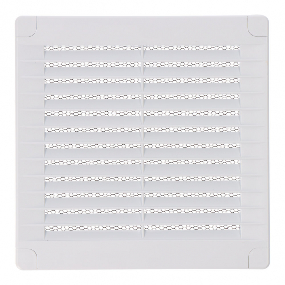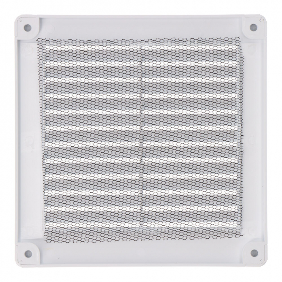Rejilla ventilación de plástico, cuadrada con tapones y mosquitera 150x150x7mm blanca