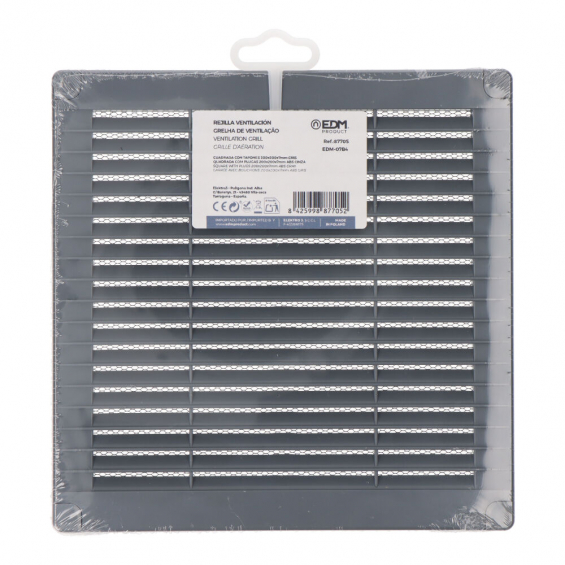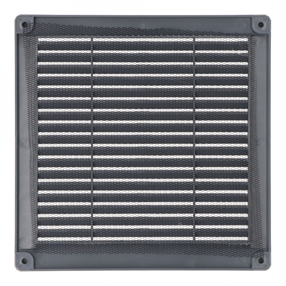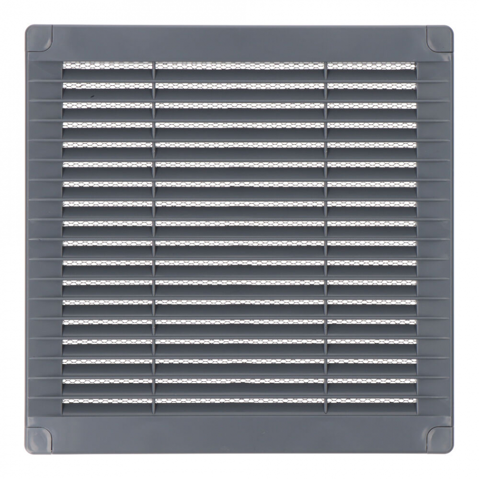 Rejilla ventilación cuadrada con tapones y mosquitera 200x200x7mm abs gris