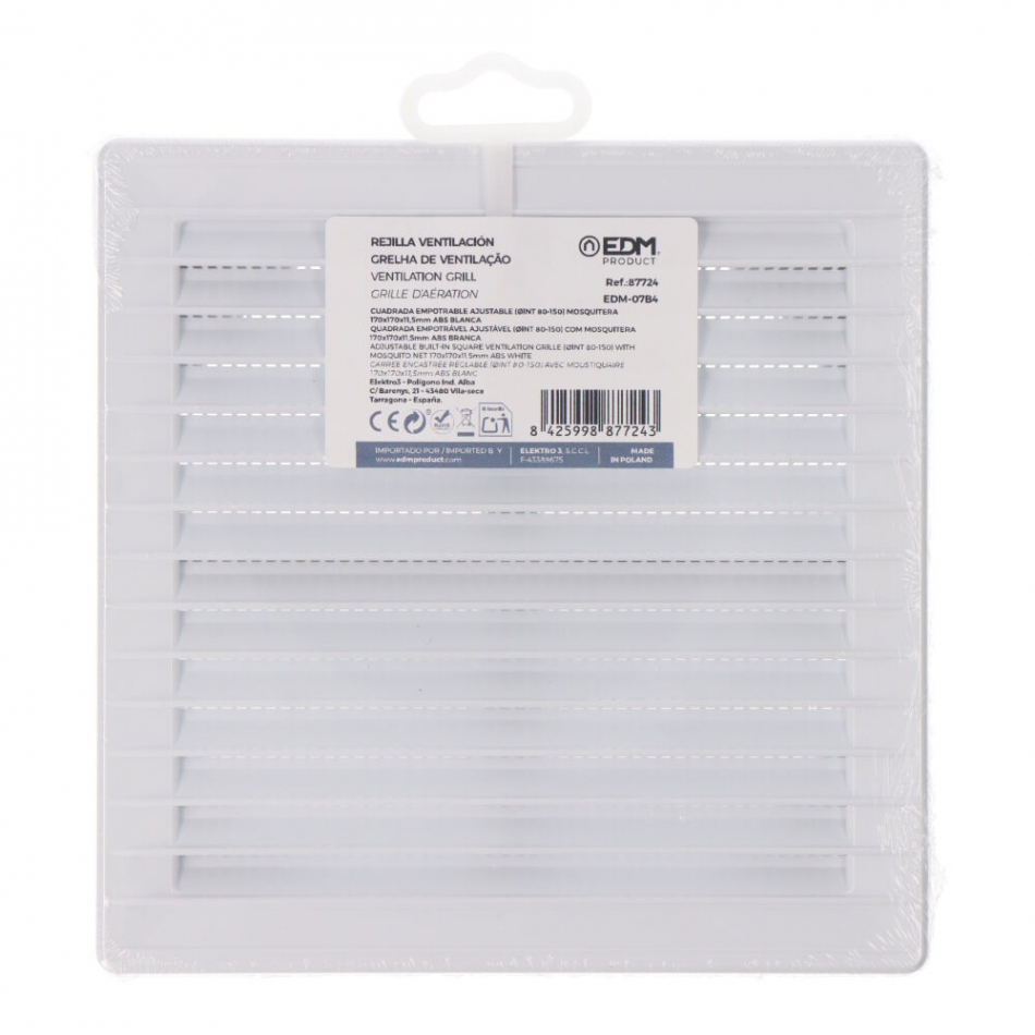 Rejilla ventilación cuadrada empotrable ajustable con mosquitera, medida enclavamiento ø 80-150, medida 170x170x11,5mm de plástico blanca