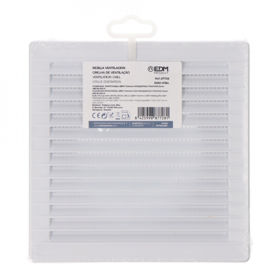 Rejilla ventilación cuadrada empotrable ø 100mm con mosquitera 170x170x10mm abs blanca