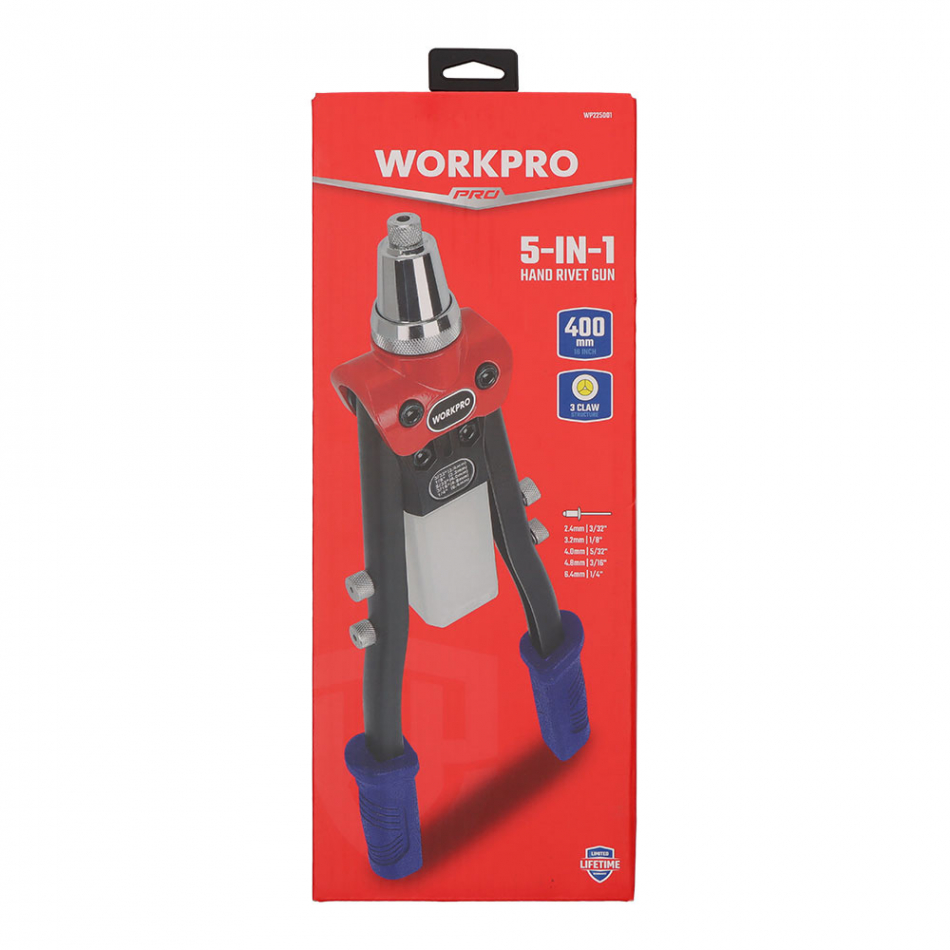 Remachadora manual 400 mm (16") , mango alto desempeño que ahorra trabajo. acero al cromo molibdeno. 5 boquillas: 2.4 mm, 3.2 mm, 4.0 mm, 4.8 mm y 6.4 mm