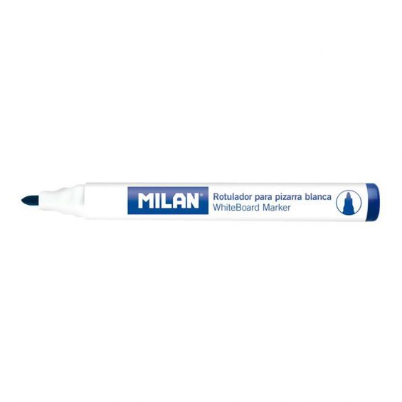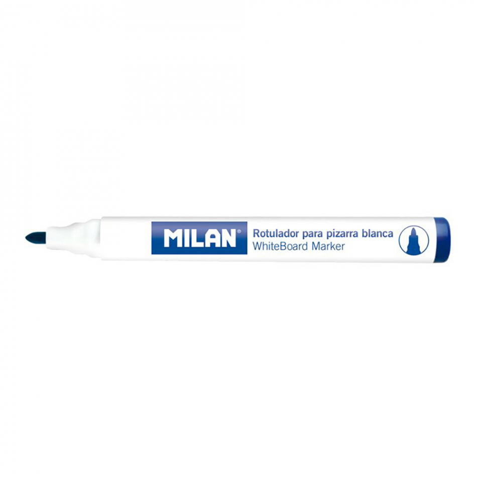 Caja de 12 rotuladores azules para pizarra blanca milan. rotuladores para pizarra blanca, color azul marino. borrable en seco. tinta a base de alcohol. punta redonda ø4,7mm. recomendamos tapar después de usar y almacenar en posición horizontal. rotuladores de recambio para el borrador magnético ref: 16529121
