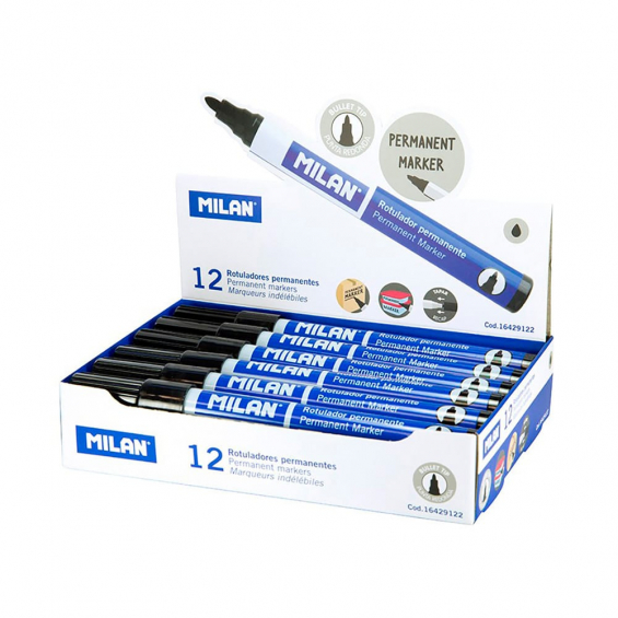 Pack con 12 rotuladores negros permanentes. punta redonda milan. rotuladores permanentes color negro. rotulador permanente sobre la mayoría de materiales. tinta a base de alcohol. punta redonda ø4mm. recomendamos tapar después de usar y almacenar en posición horizontal.