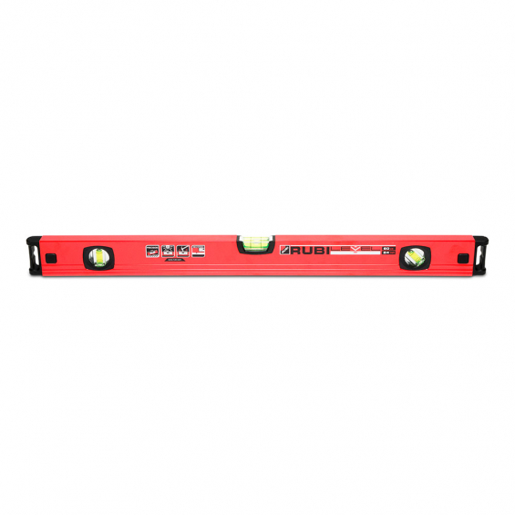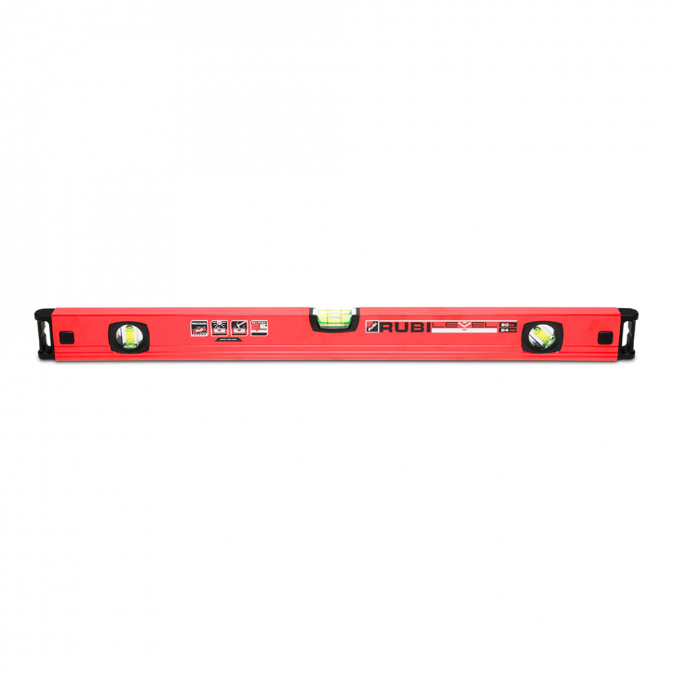 Rubilevel 60cm .fabricado en perfil de aluminio de sección rectangular degran ligereza, pero sin renunciar a la resistencia, gracias a los nervios longitudinales que aportan una mayor refuerzo estructural. la base está mecanizada para garantizar una precisión constante de 0,5mm/m. sus tres viales acrílicos, sellados con resina epoxi, ofrecen una alta resistencia a los impactos, a la vez que a los efectos negativos de los rayos uv. también permiten comprobaciones y verificaciones de niveles horizontales, verticales y en pendientes de 45°.