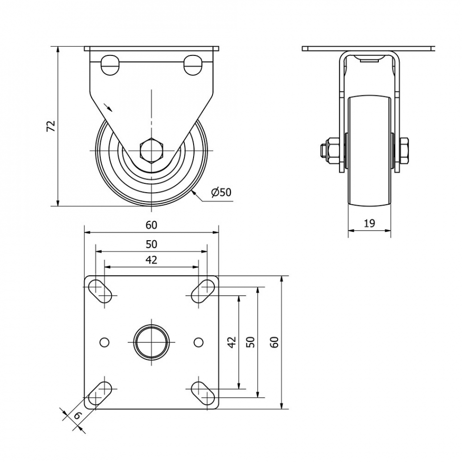 Rueda fija con placa y eje liso, color gris, material: poliamix - goma, carga máx. 40 kg, ø 5 cm