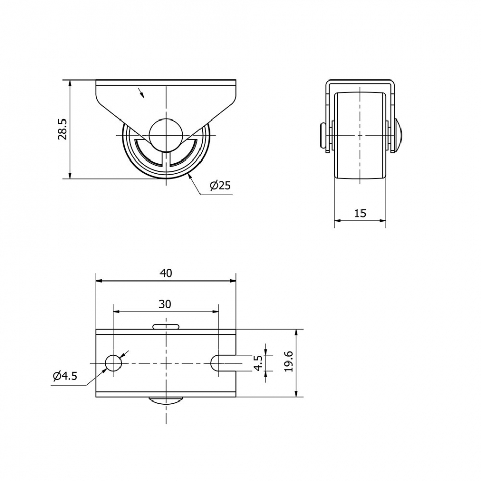 Rueda fija de goma con placa y eje liso de dos fijaciones, color gris, carga máx. 40 kg. ø 2,5 cm