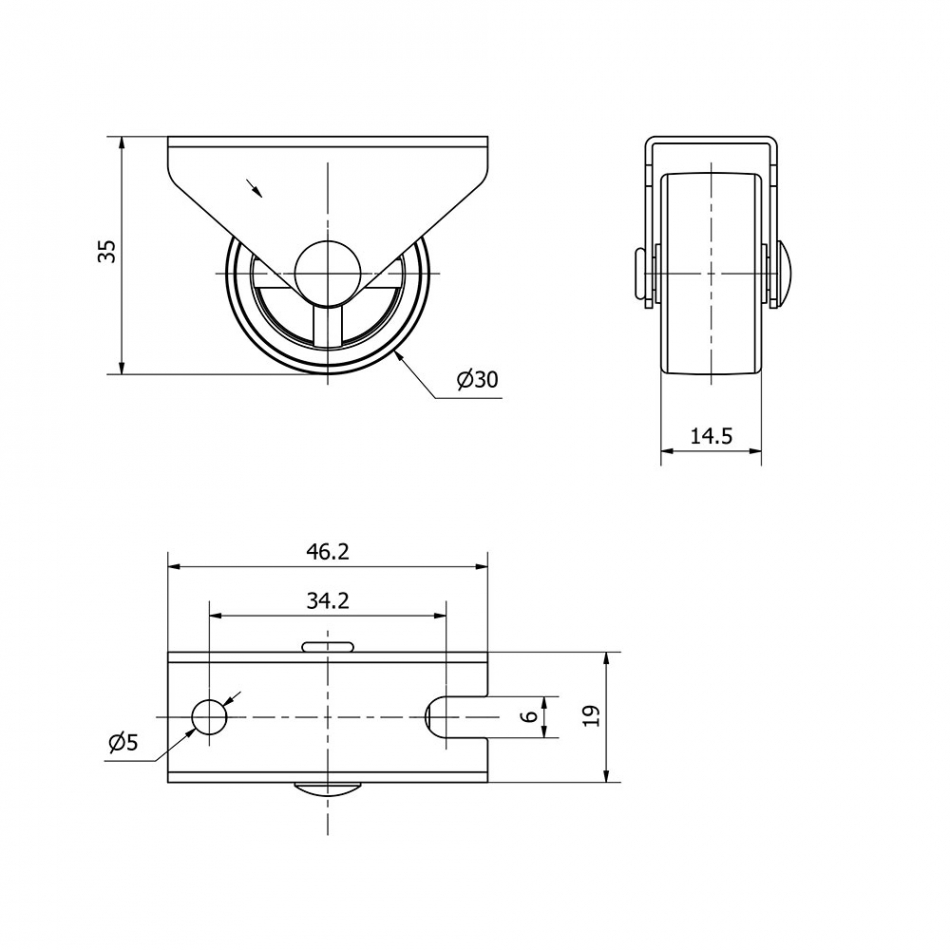Rueda fija con placa y eje liso de dos fijaciones, color gris, material: goma, carga máx. 45 kg. ø 3 cm