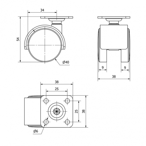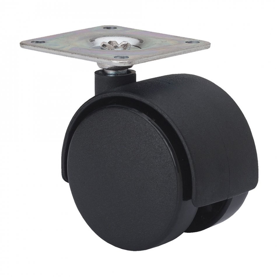 Rueda giratoria con placa y eje liso, color negro, material: polipropileno- plástico, carga máxima de 20 kg, ø 4 cm
