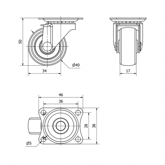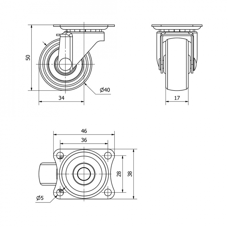 Rueda giratoria con placa y eje liso, color negro, carga máx. 20 kg, ø 4 cm