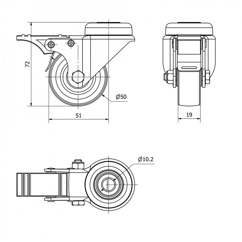 Rueda giratoria con agujero, eje liso y freno, color gris, material: poliamix - goma, carga máx. 40 kg, ø 5 cm