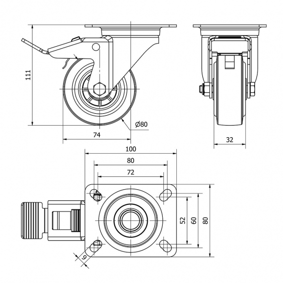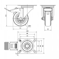 Rueda giratoria con placa eje de rodillos y freno, color azul, material: poliamix - goma, carga máx 80 kg, ø 8 cm
