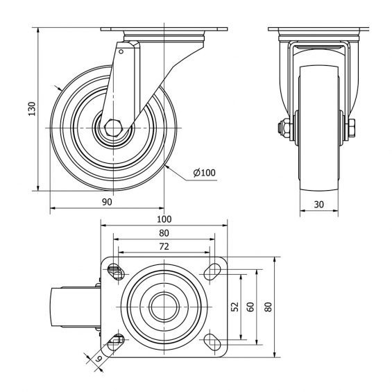 Rueda giratoria con placa y eje de rodillos, color azul, material: poliamix - goma, carga máx. 100 kg, ø 10 cm