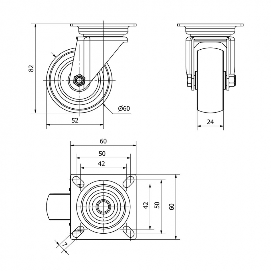 Rueda giratoria con placa y eje liso, color gris, material: poliamix - goma, carga máx. 50 kg, ø 6 cm