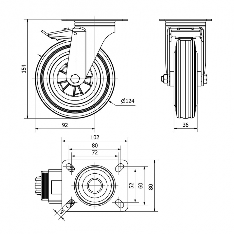 Rueda giratoria con placa, eje liso y freno, color negro, material: poliamix - goma, carga máx. 110 kg, ø 12,5 cm