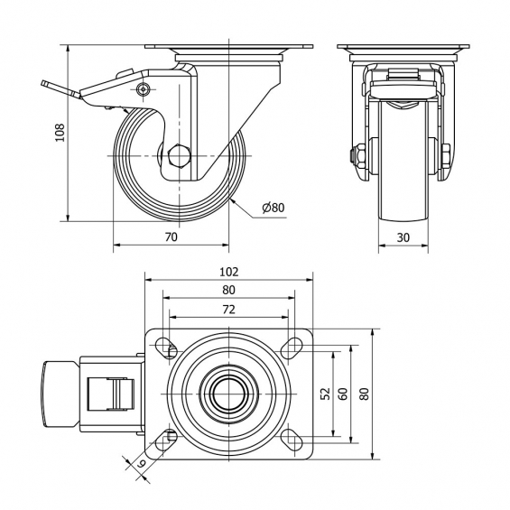 Rueda giratoria con placa, eje liso y freno, color blanco, material: poliamix, carga máx. 130 kg, ø 8 cm