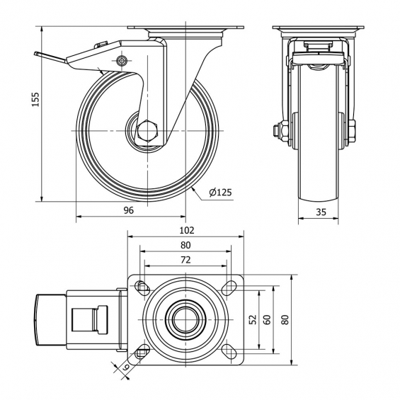 Rueda giratoria con placa, eje liso y freno, color blanco, material: poliamix, carga máx. 170 kg, ø 12,5 cm