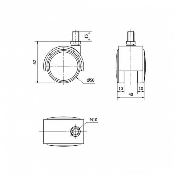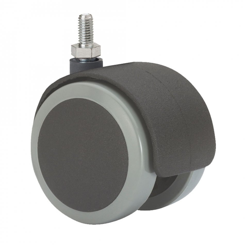 Rueda giratoria con espiga roscada y eje liso, color negro / gris, material: nylon y poliuretano, carga máxima de 50 kg, medida espiga: 10 x 15 mm, ø 5 cm