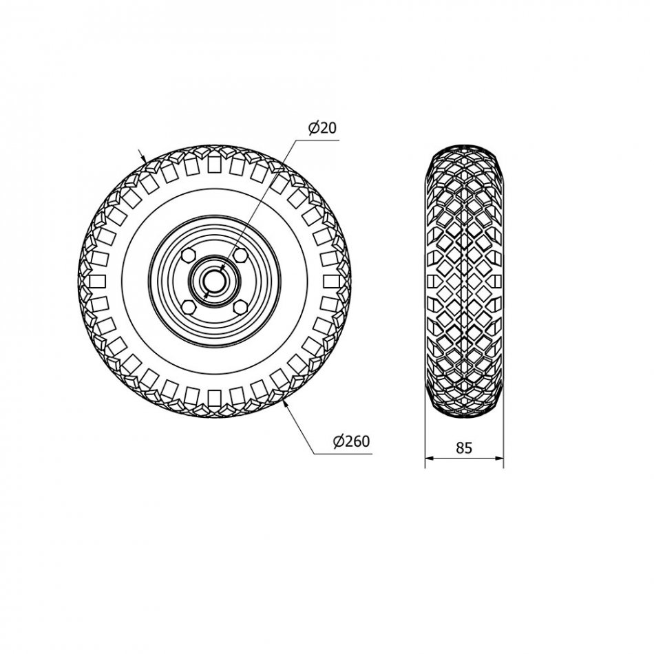 Rueda neumática con nucleo metálico y rodamiento de bolas, carga máx. 175 kg, ø 26 cm, ø agujero del buje: 2 cm