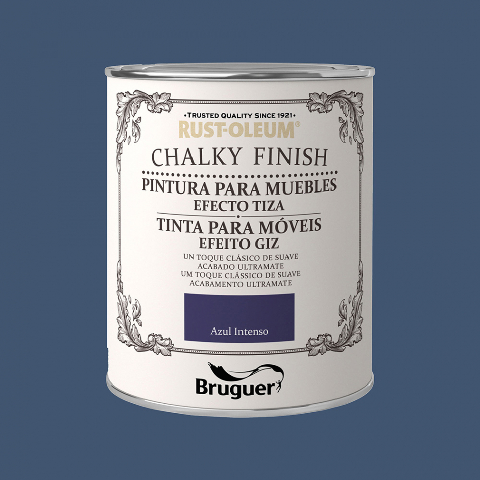 Rust-oleum chalky finish muebles azul intenso 0,750l 5397551 bruguer. pintura al agua efecto tiza, se puede aplicar en todo tipo de superficies como madera, metal, piedra, arcilla, yeso o incluso plástico, con un excelente resultado. te permite customizar desde un jarrón antiguo, una lámpara, un cesto de playa o incluso unos cojines, ya que se puede aplicar también sobre tela.