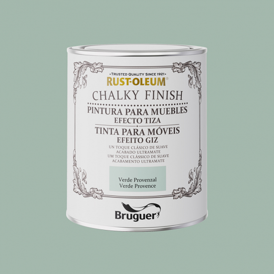 Rust-oleum chalky finish muebles verde provenzal 0,750l 5733888 bruguer. pintura al agua efecto tiza, se puede aplicar en todo tipo de superficies como madera, metal, piedra, arcilla, yeso o incluso plástico, con un excelente resultado. te permite customizar desde un jarrón antiguo, una lámpara, un cesto de playa o incluso unos cojines, ya que se puede aplicar también sobre tela.