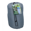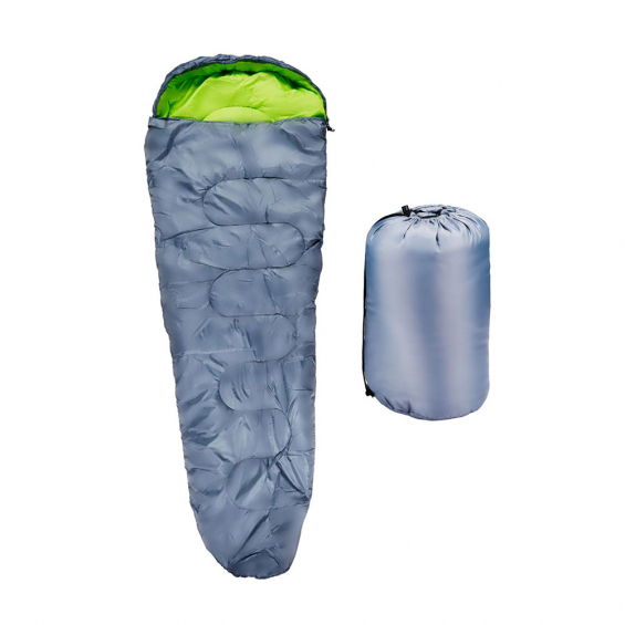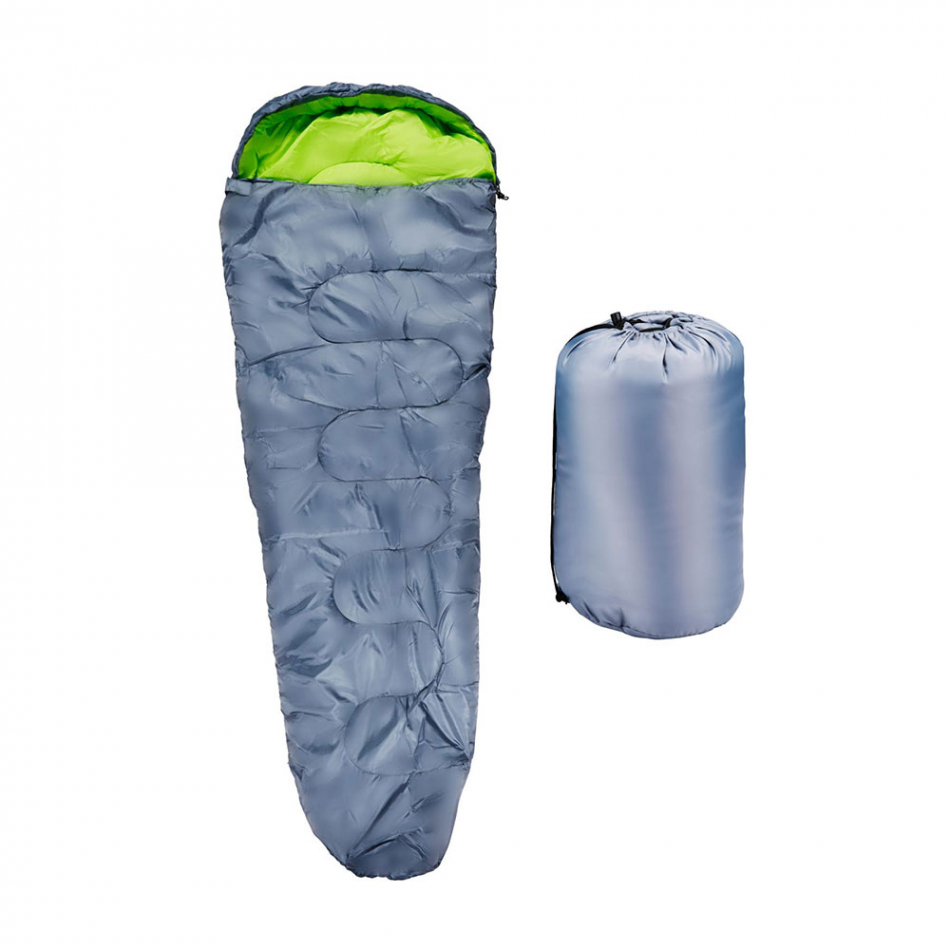 Saco de dormir gris, su interior es de color verde. confort + 10°c / limite + 5°c. dimensiones 210 x 80 cm