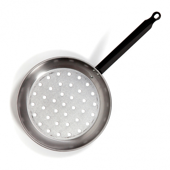Sarten asadora para castañas ø26cm. producto fabricado en acero laminado en frío. sus agujeros permiten pasar el fuego para asar las castañas. vaello