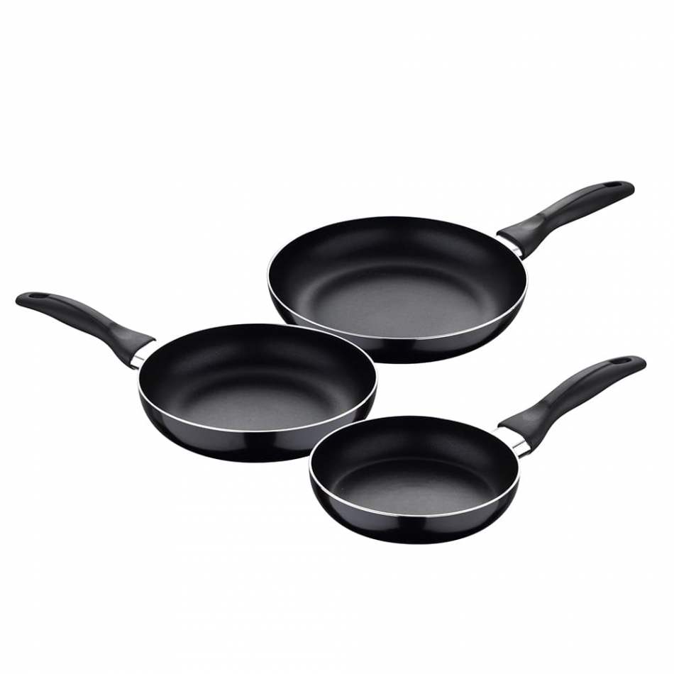 Set 3 sartenes (16+20+24cm) aluminio prensado, navy black, san ignacio. el set incluye: 1 sartén ø16x3.5cm + 1 sartén ø20x4.5cm + 1 sartén ø24x4.5cm. cuerpo fabricado en aluminio prensado. revestimiento interior antiadherente. apto para todo tipo de fuegos incluido inducción. mango de acabado profesional y ergonómico que se mantiene frío.