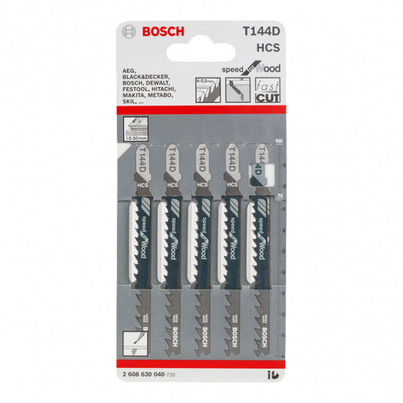 Set de 5 hojas de sierra t 144 d: speed wood 2608630040 bosch el material de acero con alto contenido de carbono corta madera blanda y materiales no abrasivos para trabajos en madera. compatible con todas las sierras de calar con vástago de inserción en t.