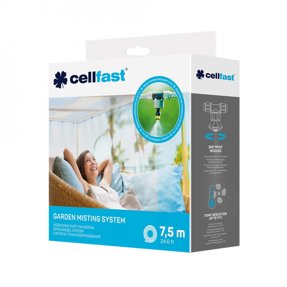 Set de climatización para exterior que reduce hasta 11 grados centígrados la sensación de calor. compuesto de tubo de 8mm de diámetro y 7,5m de longitud, conexión a la general hembra de g3/4", 4 nebulizadores, 1 nebulizador final de conexión, 10 clips de montaje, 10 abrazaderas. para colgar en el techo, pérgola o sombrilla, crea una cortina de agua que reduce considerablemente la temperatura. ideal para instalarlo con programador, temporizador, para seleccionar la frecuencia de activación. cellfast