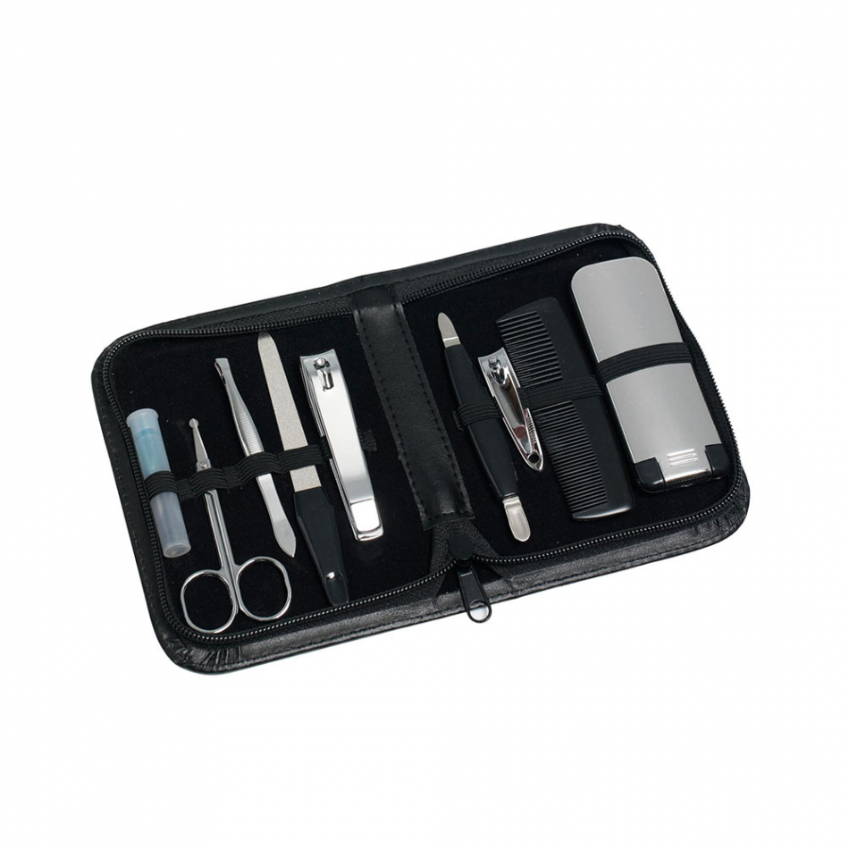 Set de viaje, 10 piezas: 2xcortaúñas, 1xpinzas, 1xtijeras, 1x lima de uñas, 1xpeine, 1xempujador de cutículas, 1xkit de reparación de gafas, 1xquitapelusas, 1xestuche de viaje. basics