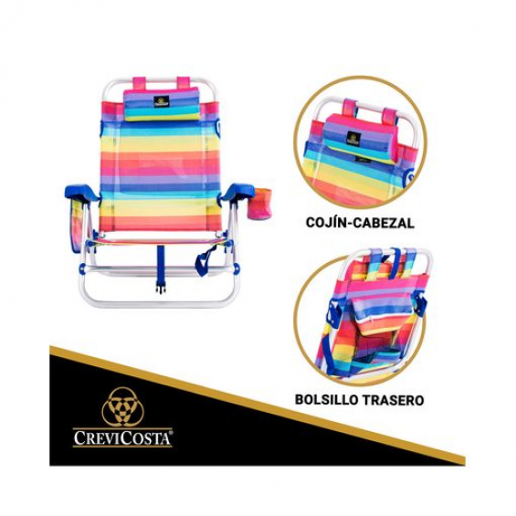 Silla de exterior y 7 posiciones. Cuenta con bolsillo lateral, porta-bebidas y mochila trasera para guardar tus objetos más necesarios. También cuenta con un cojín-cabezal ajustable en altura para sentarte cómodamente y tomar saludables baños de sol, aunque recomendamos que no sean muy largos y los combines descansando bajo una de nuestras sombrillas CREVICOSTA Protección total contra los rayos UV. Las dimensiones de esta silla-playa plegable son de 62x62x23/74 cm en su posición abierta. Plegada mide 72x58x9 cm. Esta temporada 2022 cuenta con una NOVEDAD: nuestra bolsa-mochila de transporte diseñada para hacer más fácil el traslado a cualquier parte dónde quieras ir, ya que es apta para todos los terrenos. Puedes usarla tanto en playa, camping, piscina, montaña; como en el jardín, terraza o balcón de casa. Estructura de aluminio anodizado brillante con tubo de Ø 22 mm. Fuerte y robusta, tiene un peso de 2.8 kg y una resistencia máxima de 110 kg. Tejido textilene 2x1 de 600 gramos muy flexible, totalmente resistente al agua y de secado rápido. Transpirable para permitir la circulación de aire, dando así una sensación de frescor muy agradable. Todas estas características hacen que nuestras sillas sean de las mejores del mercado. Y para que las conserve mejor le damos un consejo de limpieza: aplicar agua dulce (nunca salada ni agua de mar) con un trapo húmedo y jabón neutro. No introducir el aluminio en agua salada ni utilizar productos abrasivos, de esta manera garantiza que no perderá el brillo inicial.