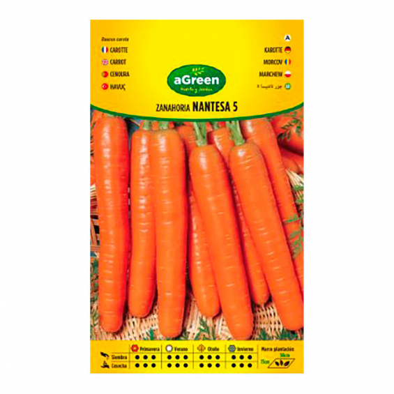 Sobre con semillas de zanahoria nantesa agreen. raíces bien formadas, sin corazón, muy dulces y de piel fina, color anaranjado intenso y dulce sabor.siembra todo el año con preferencia de febrero a mayo. recolección a los 3 ó 4 meses de su siembra.