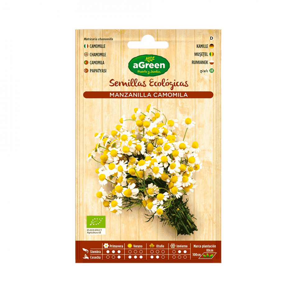 Sobre con semillas eco de manzanilla agreen. sus flores se utilizan como infusión muy apreciada por su sabor, y en medicina como digestivo, antiséptico, estimulante y refrescante.