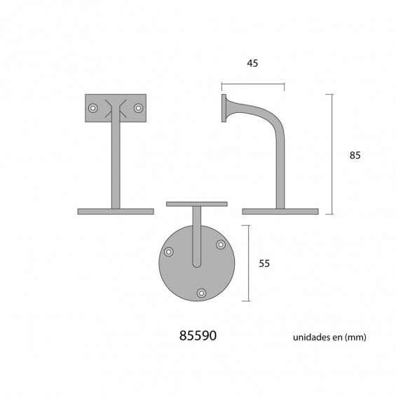 Soporte para barandilla de latón pulido dorado. modo de fijación 3 tornillos. medida de la base ø5,5 cm, medida del soporte 4,5 x 2 cm
