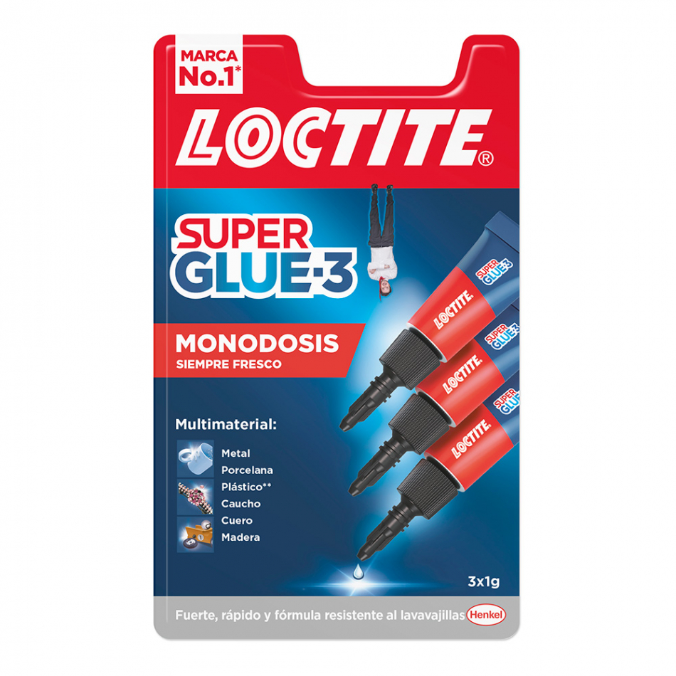 Super glue mini trio 3 x 1 g practico envase de una dosis adhesivo universal instantaneo maxima fuerza union en pocos segundos nueva formula resitente al agua y al lavavajillas para pegar en pocos segundos todos los tipos de materiales: porcelana, madera, plastico, metal, goma, cuero, marmol