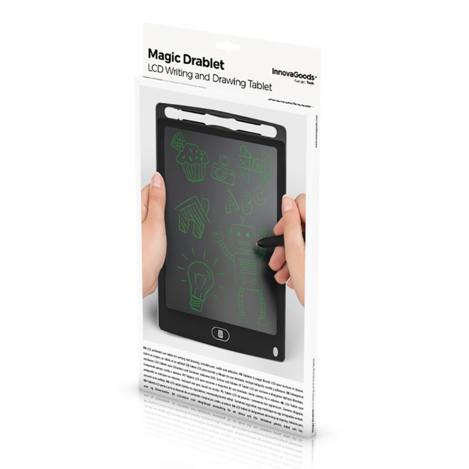 Tablet táctil lcd, material: abs, negra. incluye:bolígrafo digital, manual en 24 idiomas. botón de borrado automático, 2 imanes, 2 adhesivos de doble cara para fijarla. funciona con 1 pila cr2016 (incluida).14,5 x 22,5 x 0,5 cm.