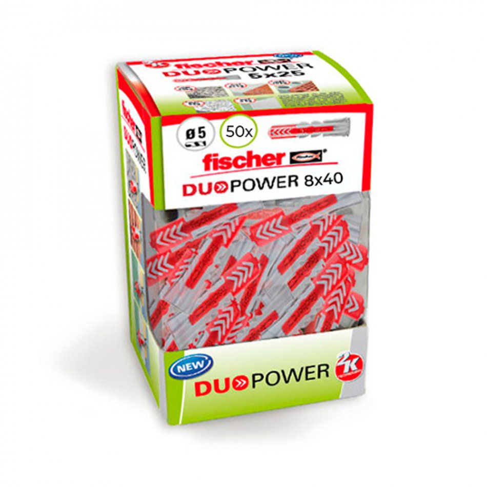 Taco duopower ø8 x 40 mm, caja 50 uds. en formato caja bricolaje. combinación de dos componentes de materiales para un mayor rendimiento.funciones seguras para materiales macizos (expansión) y perforados o placas (bloqueo/anudado). montaje sencillo: el borde estrecho del taco impide que se hunda en la perforación.mejor respuesta posible del taco: se nota que el taco encaja a la perfección. aplicaciones: muebles de televisión, iluminación, estantes, armario con espejo, cuadros, fijación de persianas, raíles de cortinas, fijaciones de lavabos, fijaciones de fontanería y calefacción, instalaciones de baños y servicios, armarios de pared, campanas extractoras etc. materiales: hormigón, ladrillo macizo, hormigón celular, placas y paneles de yeso, piedra natural, paneles aglomerado etc