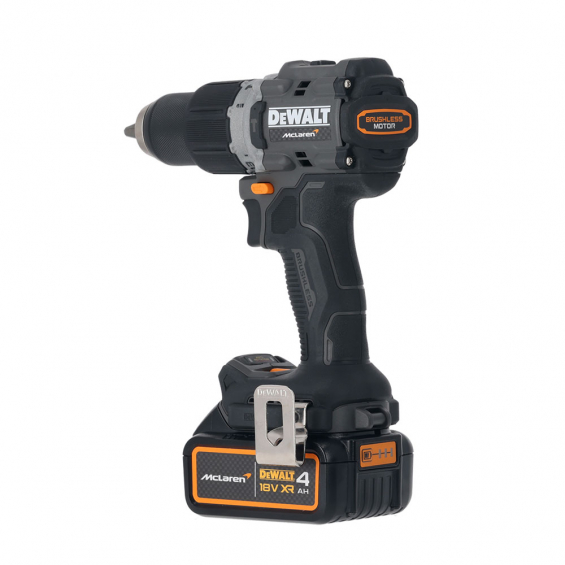 Taladro percutor mclaren sin escobillas xr 18 v ,portabrocas ø13 mm, apriete de 90 nm, con 2 baterías li-ion 4 ah, con luz de trabajo, clip para colgar y maletín tstak