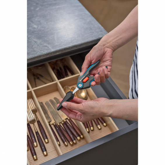 Tijera freshcut de gardena es especialmente adecuado para cosechar hierbas frescas, bayas o flores cortadas. las cuchillas de precisión estrechas y puntiagudas hechas de acero inoxidable duradero y resistente a la corrosión lo impresionarán con cada corte. con la ayuda de freshcut, logrará realizar cortes limpios y precisos hasta la punta.