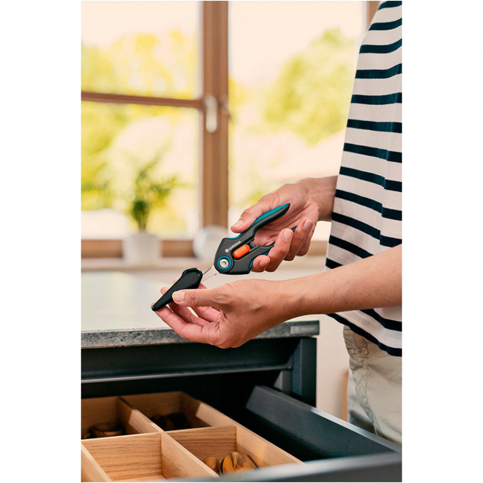 Tijera gripcut de gardena está equipado con una pinza y le permite cortar y sujetar al mismo tiempo con una sola mano gracias a la función de sujeción integrada. la versatilidad de gripcut es extremadamente útil: corte hierbas frescas como una ramita de perejil o cebollino y sosténgalas al mismo tiempo. la cosecha de chiles en particular se hace más fácil y ningún jugo picante se manchará los dedos.