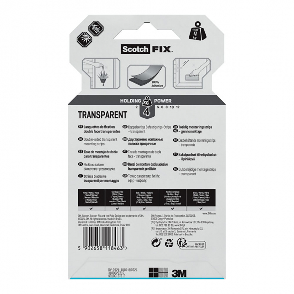 Tira adhesiva doble cara, transparente, 25mmx76mm, 8 uds, 4910c-st8-p, max 4 kg