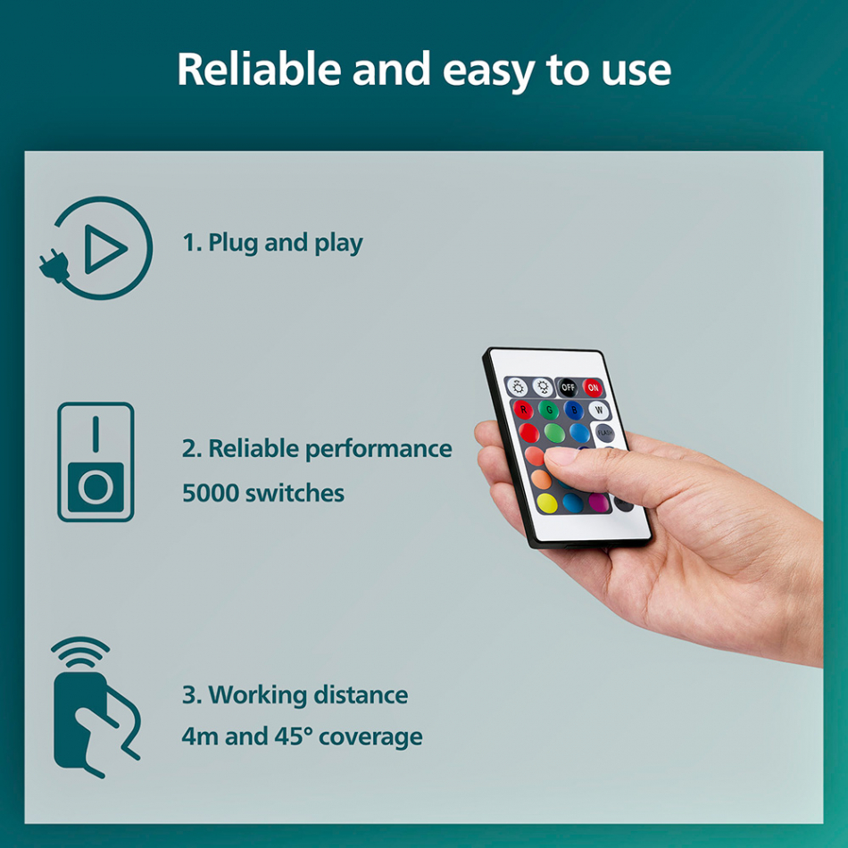 Tira led rgb adhesiva con mando a distancia 16 colores, efectos de luz dinámicos se puede cortar para ajustar el tamaño protección: ip20 vida útil: 20.000 h entrada 220 - 240 v ac 50-60 hz 12 w, salida 12 v dc 12 w dimensiones 5 m