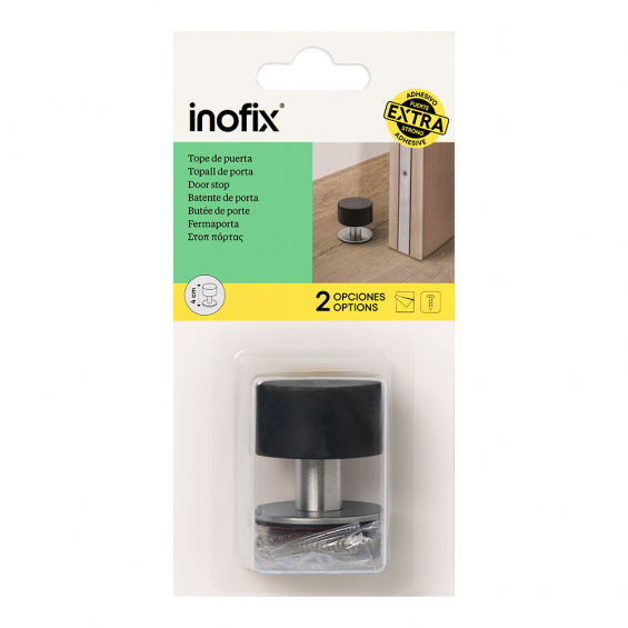 Tope de puerta alto extrafuerte con amortiguador negro. adhesivo extrafuerte o fijación con tornillo incluido. especialmente diseñado para puertas pesadas o de grandes dimensiones. fabricado en acero inoxidable aisi 304. puede instalarse en el suelo o en la pared. medidas: tope 40 x 40 x 40 mm taco amortiguador 21 x 40 x 40 mm